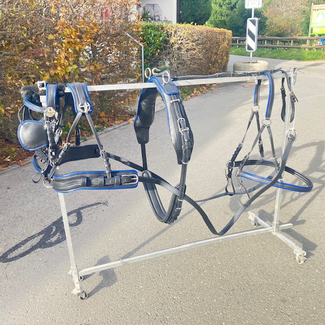 Très solide et léger, poitrail en forme anatomique, conçu pour atteler à un et à deux chevaux, lavable au jet, boucles en inox, avec bride et simple guides.