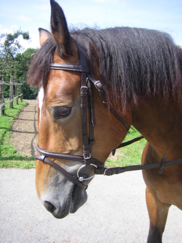 Bride classique en cuir véritable, muserolle irlandaise comme sur photo, cousu en fil blanc, avec rênes en tissu, sans mors Couleurs: brun foncé Tailles: poney, pur-sang, demi-sang Martingale assortie: Fr. 40.00